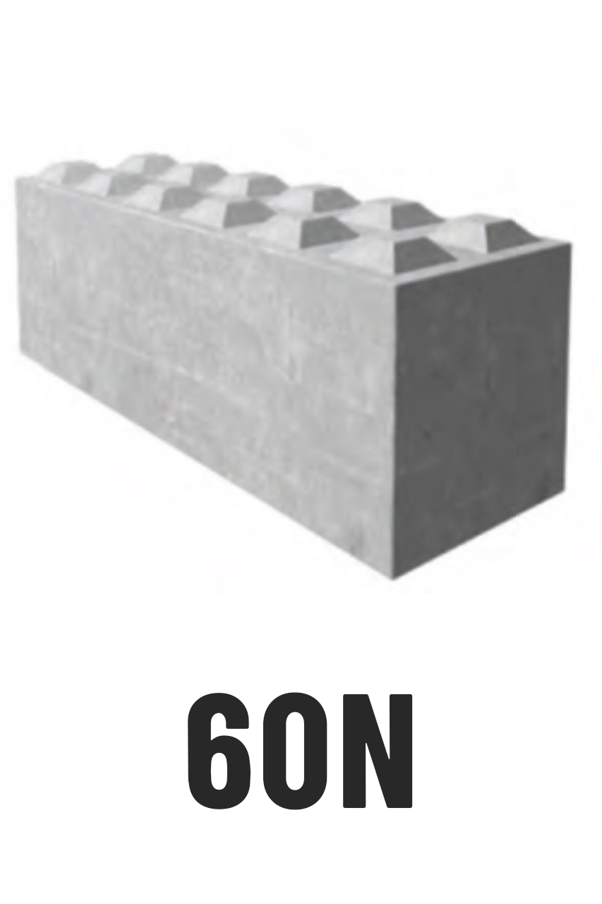 Betonový blok 60N je masivní stavební prvek s horními pyramidovými zámky, které umožňují jednoduché skládání bez použití malty či spojovacích materiálů.